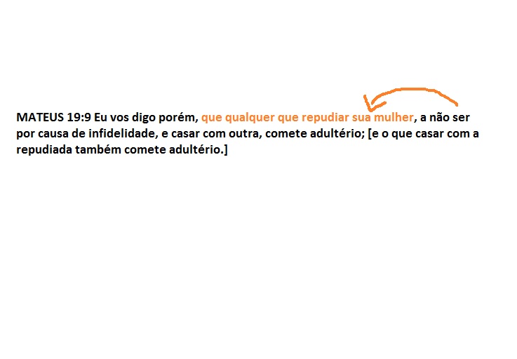 No verso 9 se faz muita confusão devido a frase –…,a não ser por causa de infidelidade, e casar com outra,.. – estar entre vírgulas. Vejamos antes da vírgula temos a frase – Eu vos digo porém, que qualquer que repudiar sua mulher – na língua portuguesa e em qualquer lugar, a frase entre vírgulas é uma explicação de condição para a frase antes da vírgula. De forma alguma seria uma explicação, para o que ainda iria se falar, como muitos querem acreditar. Veja a ilustração.
